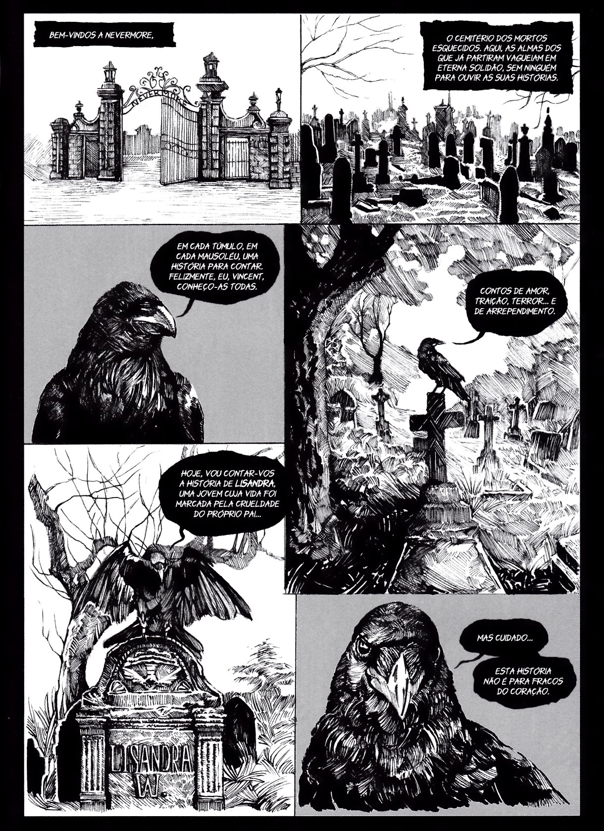 Vincent, o corvo, é o anfitrião que nos leva numa viagem pelo cemitério de Nevermore, enquanto dá a conhecer as histórias (macabras e sombrias) que se escondem em alguns das suas campas. Uma antologia de histórias curtas de terror, “Tales from Nevermore”, é ao mesmo tempo uma homenagem aos grandes clássicos do género. São seis histórias de amor, traição, terror, ciúme, ganância e arrependimento... Cada uma dessas histórias irá conduzir o leitor a um desfecho mais ou menos inesperado e sombrio. Com ilustrações impressionantes, este é um livro que vai muito além do terror e surpreende o leitor a cada página. Porque nunca se sabe o que podemos encontrar num livro fechado ou na página seguinte. Este é um livro que existe também para além das páginas do livro físico e por isso permitirá ao leitor descobrir um universo clássico, mas em expansão constante e interactiva. Vincent, o corvo, está sempre à espera de novos habitantes para o seu cemitério… “Tales from Nevermore”, que a Ala dos Livros agora publica, é a surpreendente e muito aguardada obra de estreia com os autores de Banda Desenhada de Pedro N. e Manuel Monteiro.
