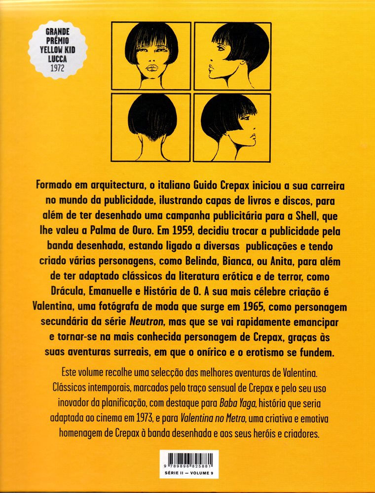Embora nascida como personagem secundária noutra série de Guido Crepax, Valentina, uma sensual fotógrafa de moda vai tornar-se a mais conhecida personagem do seu autor, graças às suas aventuras surreais, em que o onirismo e o erotismo se fundem. Este volume recolhe uma selecção das melhores aventuras de Valentina. Clássicos intemporais, marcados pelo traço sensual de Crepax e pelo seu uso inovador da planificação, com destaque para Baba Yaga, história que seria adaptada ao cinema em 1973, e para Valentina no Metro, uma criativa (e emotiva) homenagem de Crepax à Banda Desenhada e aos seus heróis e criadores.